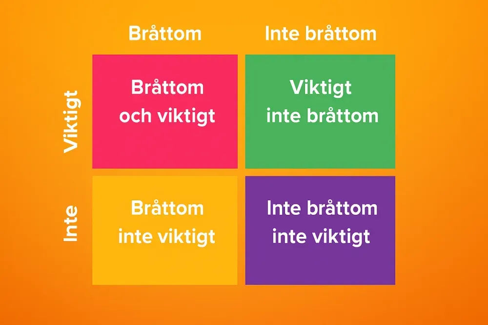 2) Dela sedan in dem i ett 2×2‑rutnät: Viktigt/Inte viktigt och Bråttom/Inte bråttom.