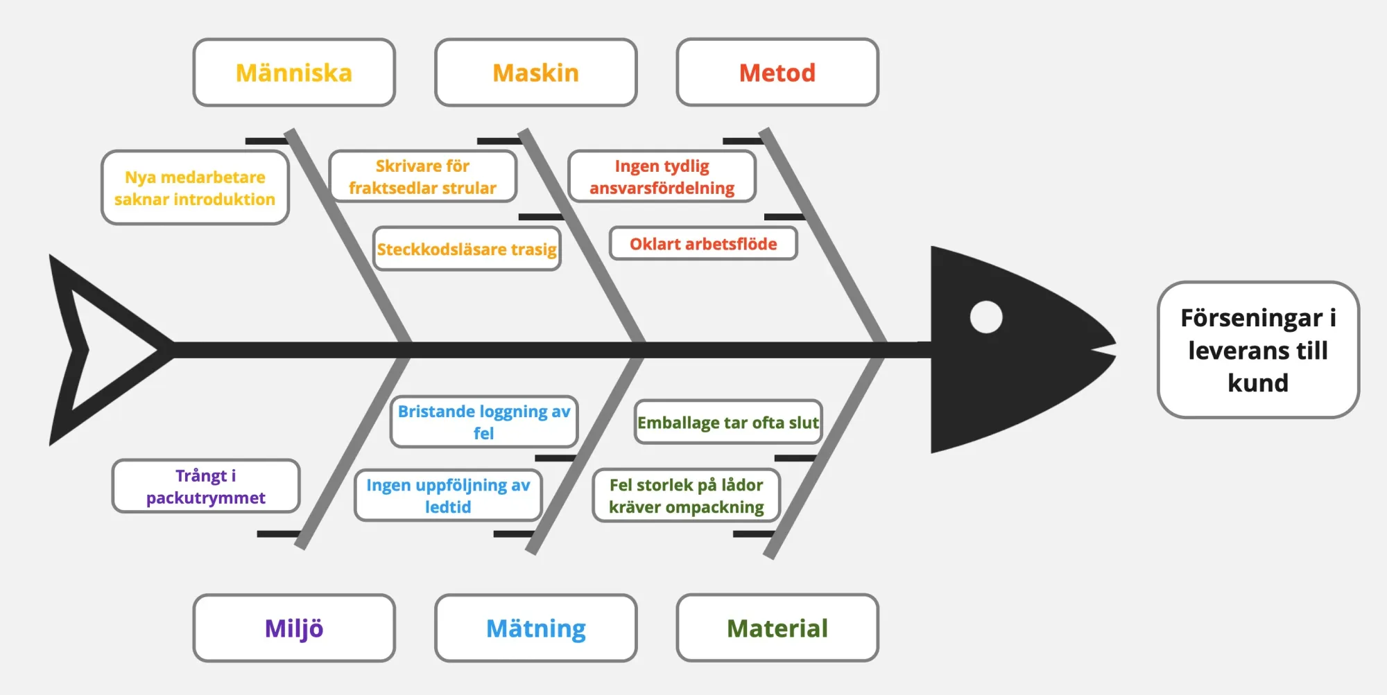 Problem: Förseningar i leverans till kund. Vi börjar med att mappa upp kategorier och exempel på möjliga orsaker.